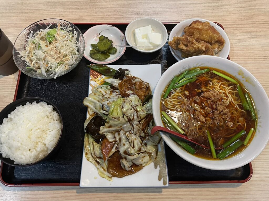 注文したのは、回鍋肉と台湾ラーメンのセット。さらに、からあげまで付いてくるという、かなりボリューミーな内容です。回鍋肉は濃いめの味付けでご飯が進み、台湾ラーメンはピリッとした辛さの中にしっかり旨みがあり、最後まで飽きずに食べられました。からあげも想像以上にしっかりしたサイズで、満足感はかなり高め。