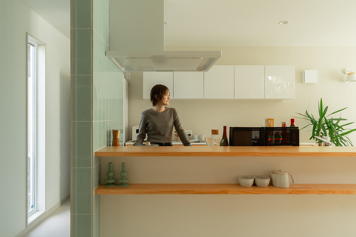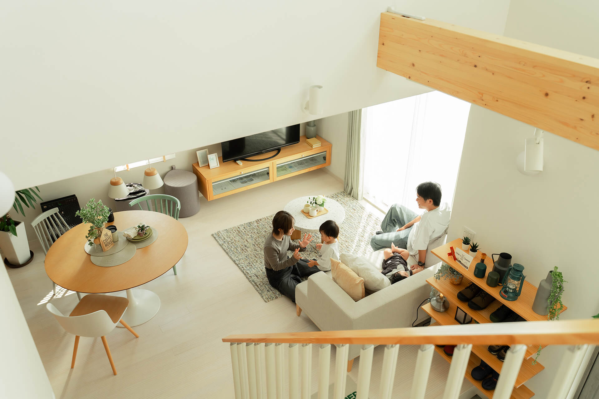 吹き抜けでつながる開放的な空間は、視線や風、声が心地よくめぐり、家族がどこにいてもお互いの気配を感じられる住まいです。