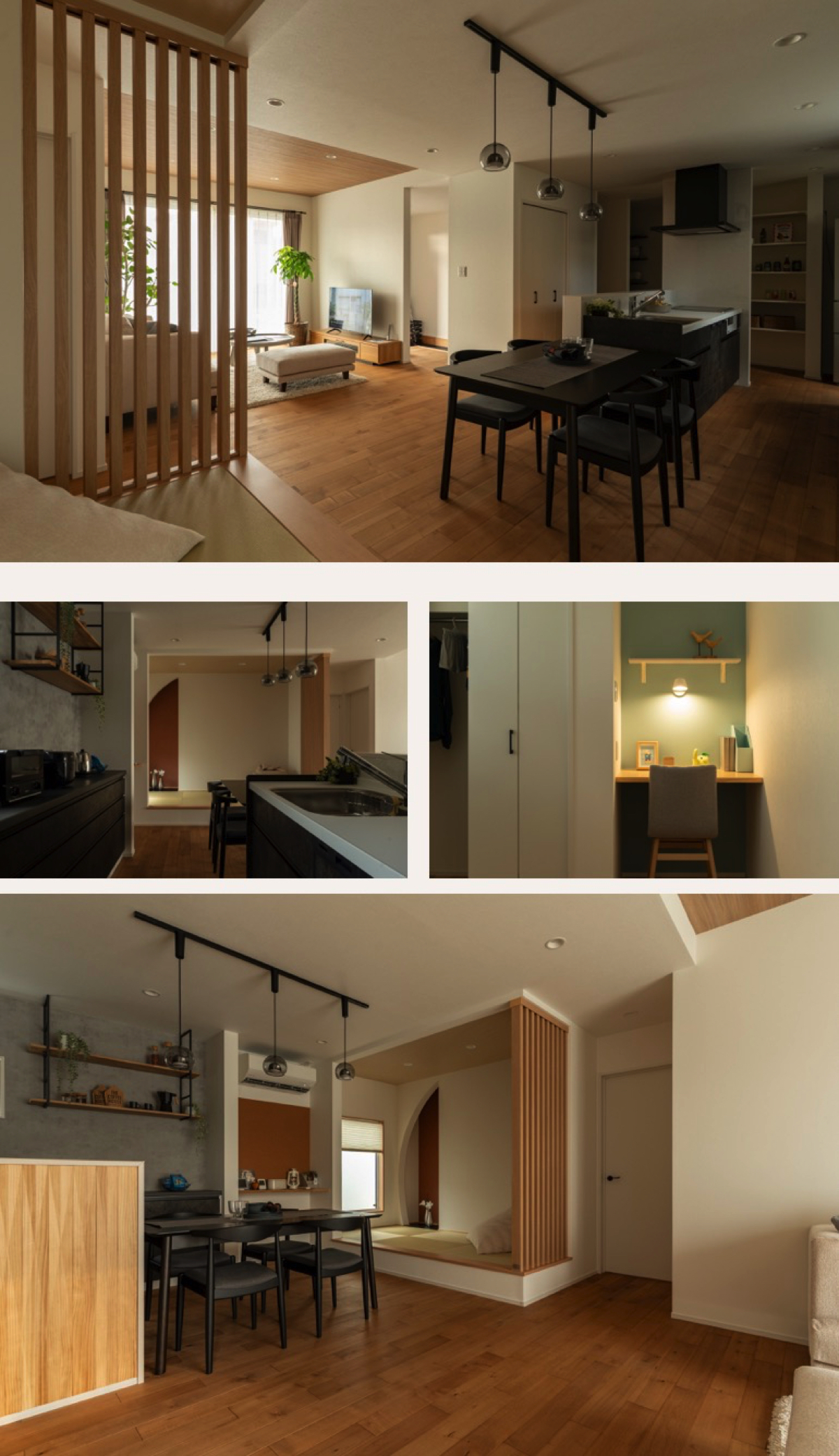 キッチンから各水回りへぐるりと回遊できる動線は、家事の負担を劇的に軽減。小上がりのタタミスペースは、お昼寝やキッズスペースとしてマルチに活躍します。