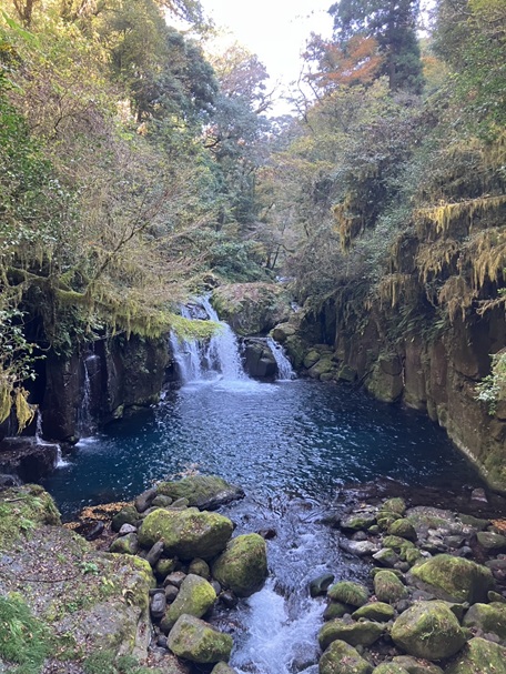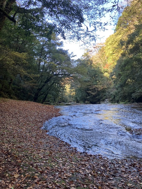 深い青の滝壺や河原の落ち葉の絨毯を眺めながら、新鮮な空気の中を散策。