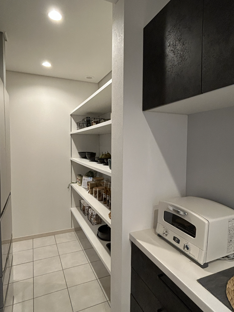 パントリーがあることで、キッチン周りに物が溢れるのを防ぎ、いつもスッキリとした状態を保てます。