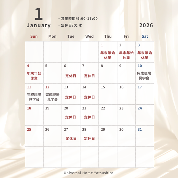 八代店 manager 【カレンダー】-八代店-1月の営業日のお知らせ 2026.01.01 カレンダー Author 八代店 manager 記事一覧 【コラム】機能美でつくる、理想の暮らし。-第1回- コラム 2026.01.22 【建築現場レポート】現場の『今』をお届けします! 三大建設のこと現場の進捗 2026.01.19