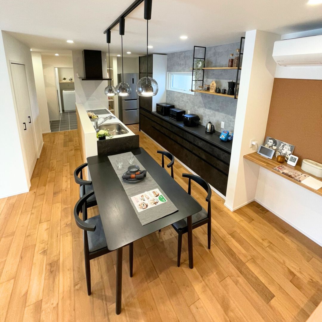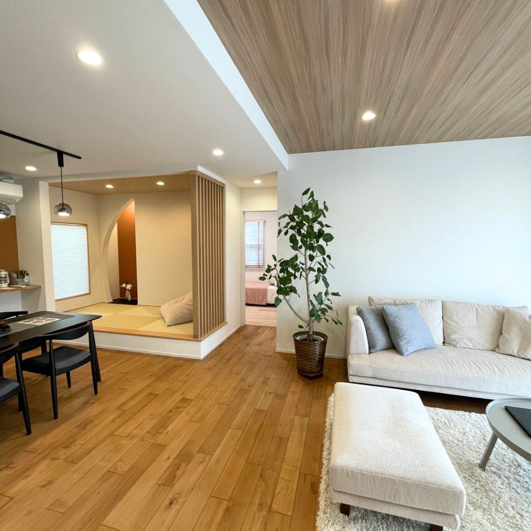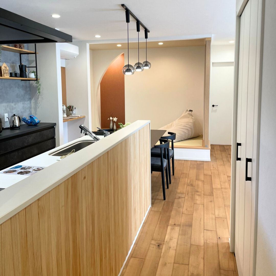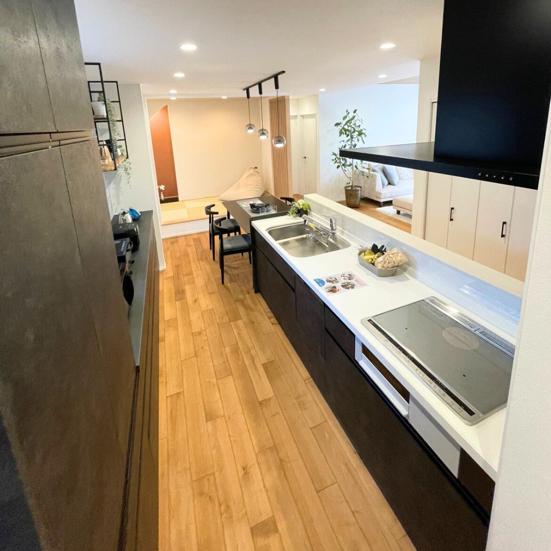 キッチンとダイニング、畳コーナーが並ぶ