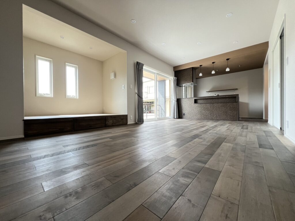 室内には、アンティークブラウンに仕上げた無垢材の床を採用しました。