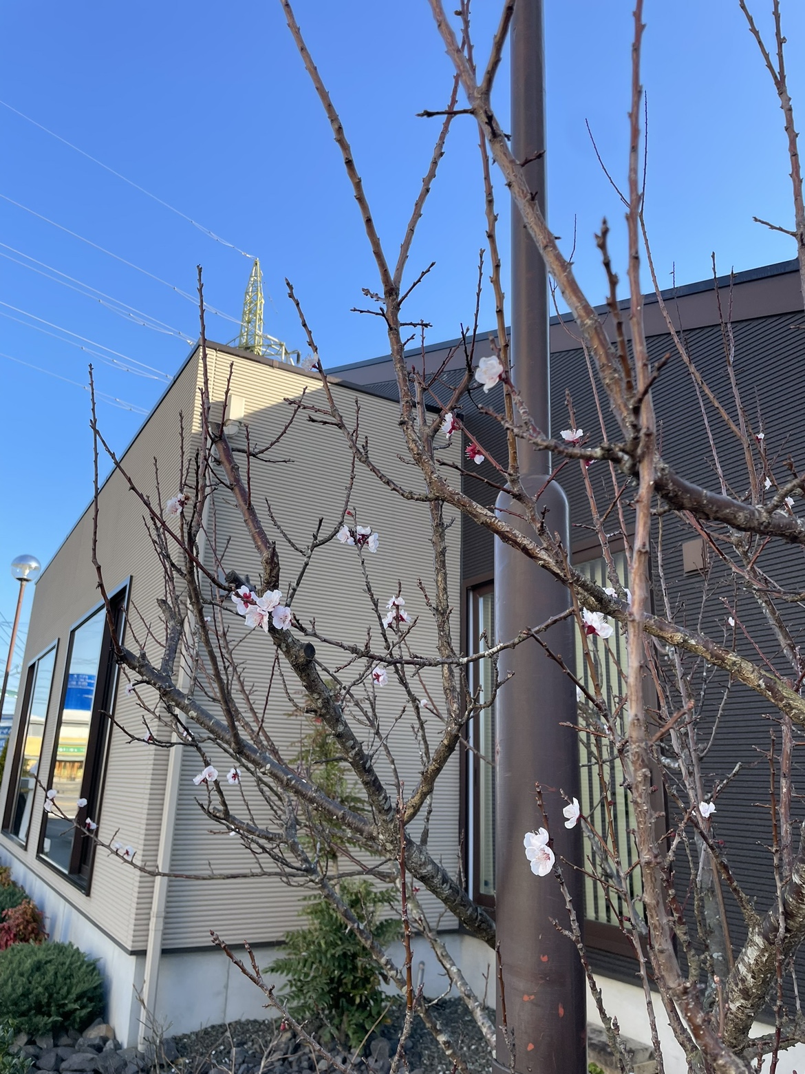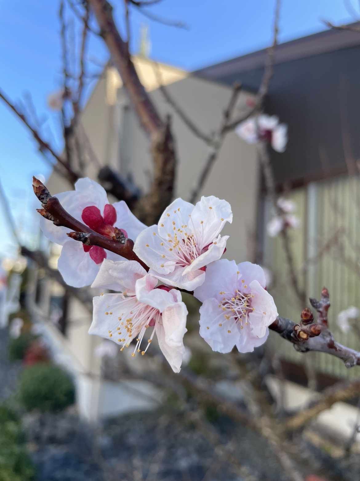 先日、モデルハウスの庭にある梅の枝に、そっと花が咲き始めているのを見つけました。