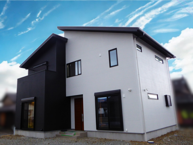 - ホワイトとブラックの外壁色と段違い屋根のシャープな外観