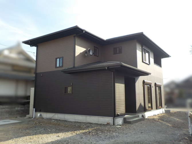 広いテラスがある黒を基調とした重厚感ある2階建てのお家