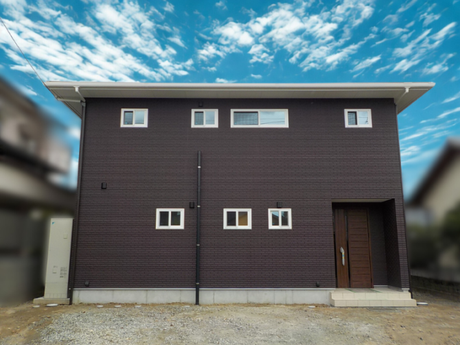 広いテラスがある黒を基調とした重厚感ある2階建てのお家