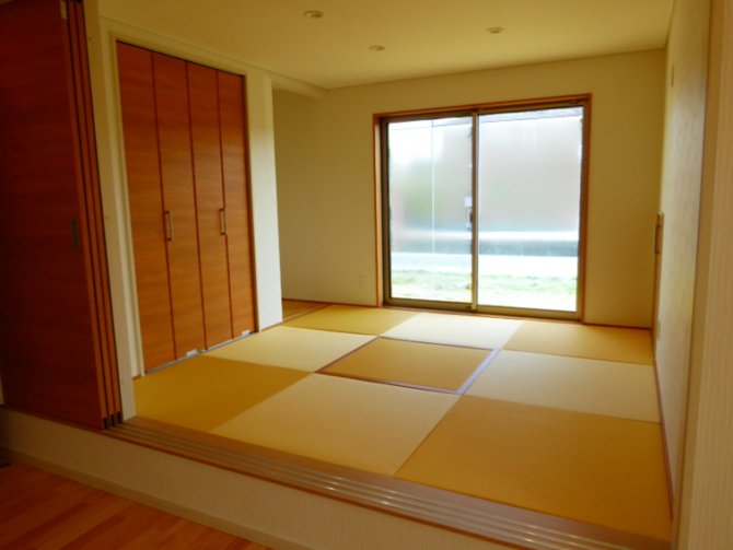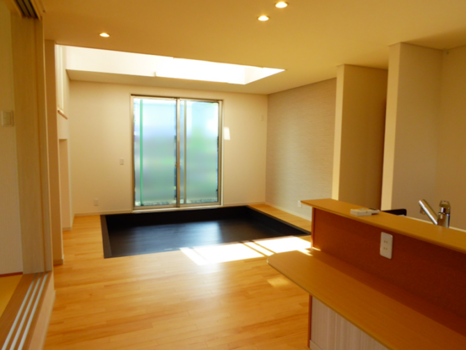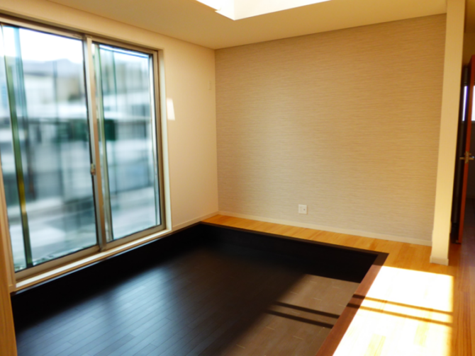 - 和室は立体感ある空間になるよう小上がりに。中央の畳を外せば掘りごたつになります