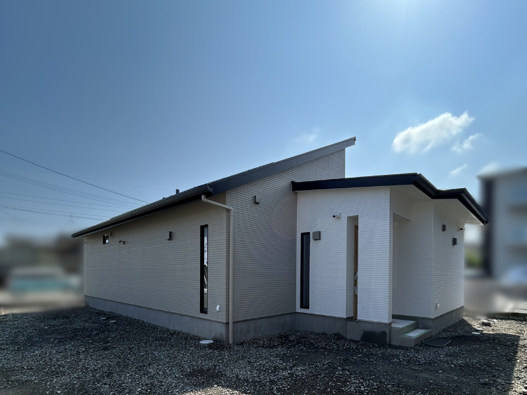 - 【外観】軒を深く出した片流れ屋根が、シャープな印象を与えるモダンな外観。 明るいナチュラルカラーの外壁色で、青空に映える洗練された佇まいです。