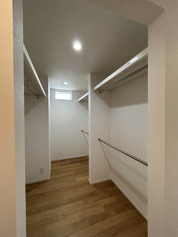 - 【ウォークインクローゼット】夫婦二人の衣類をまとめて収納できる大容量のウォークインクローゼット。ハンガーパイプと棚を効果的に配置し、衣替えのストレスを軽減します。