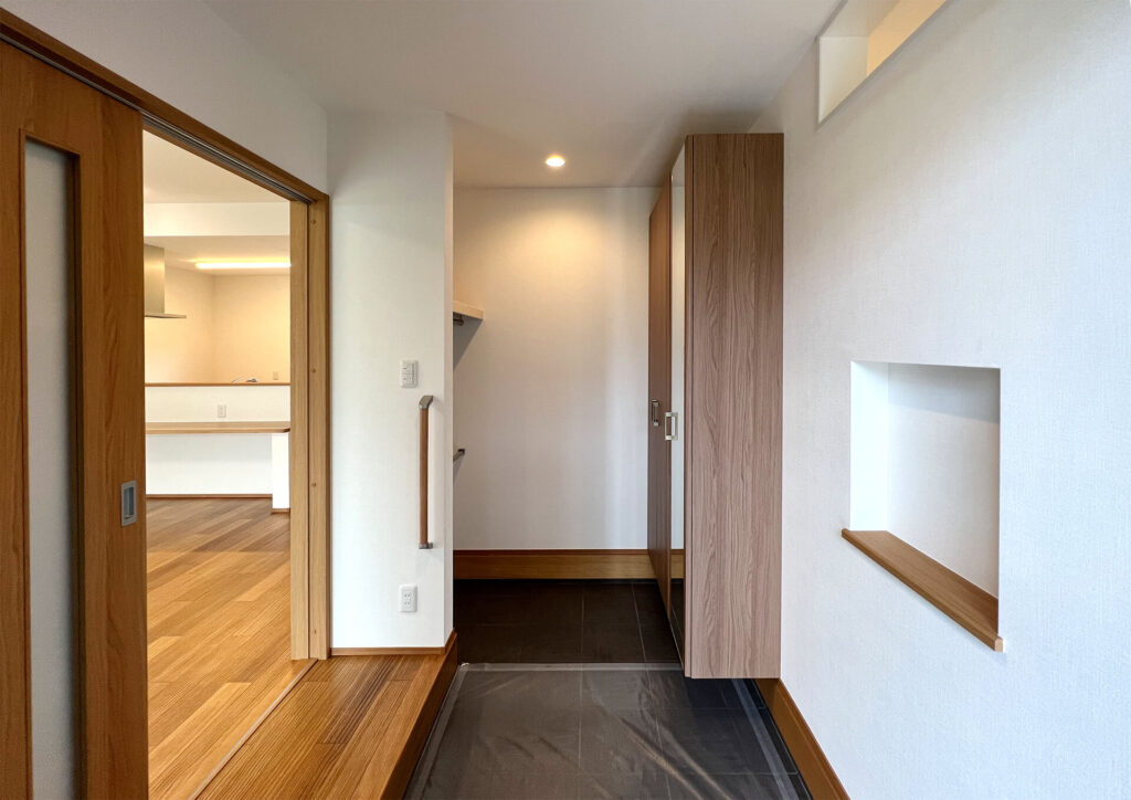 上着を脱いで玄関にかけて外の汚れを室内に持ち込まない工夫がされた玄関