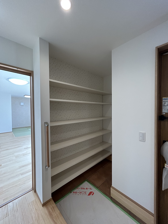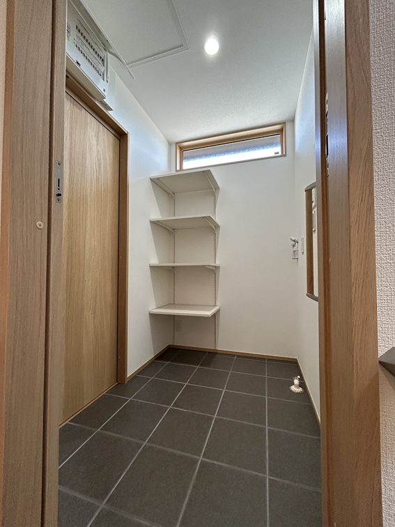玄関収納とは別に6段の可動棚が設置されており、外で使うもの(アウトドア用品、お子様の遊び道具など)をすっきりと収納できます。