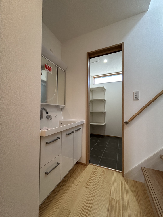 洗面所と脱衣所は、それぞれ独立した空間として設計されており、家族が入浴中でも洗面台を使用できます。