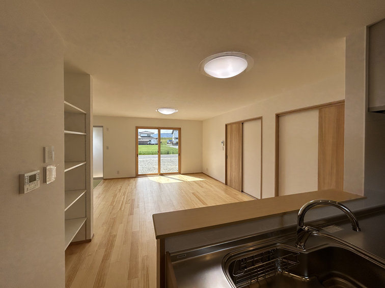 キッチンは対面式で、家族と会話をしながら料理ができる開放感のある空間です。