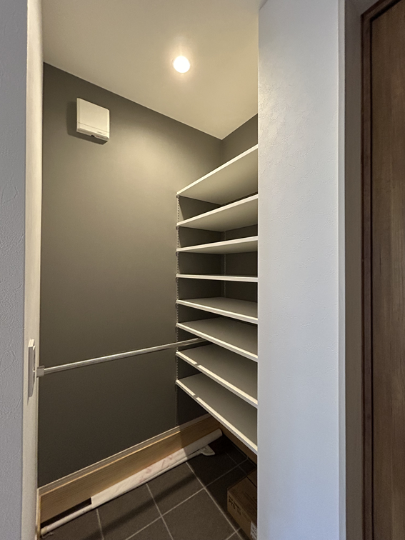 可動棚とパイプハンガーを備え、大容量の収納を叶えるシューズインクローク。