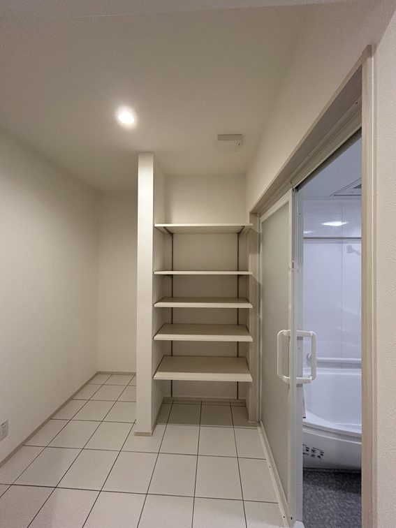 ゆったりとした広さの脱衣所には、タオルや着替えの収納に便利な可動棚を設置。
