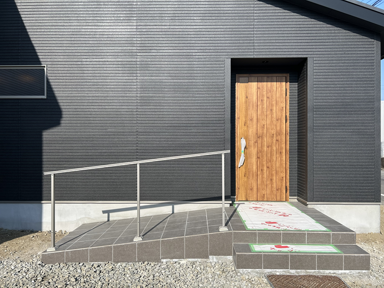 玄関アプローチからポーチへは、踏み面が広く安定感のある階段と、緩やかなスロープが設けられています。