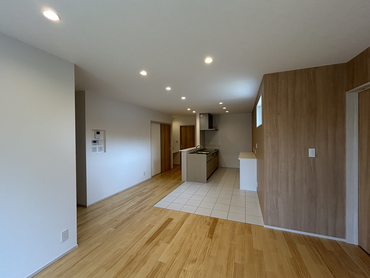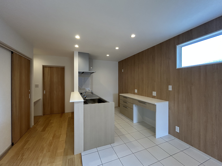 キッチン前にはアクセントウォールと一体のカウンターデスクを備え、多目的に使える快適な住空間です。