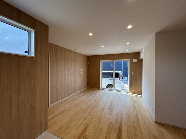 天井のダウンライトが空間全体を均一に照らし、奥の大きな窓からは光が降り注ぎます。
