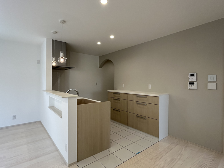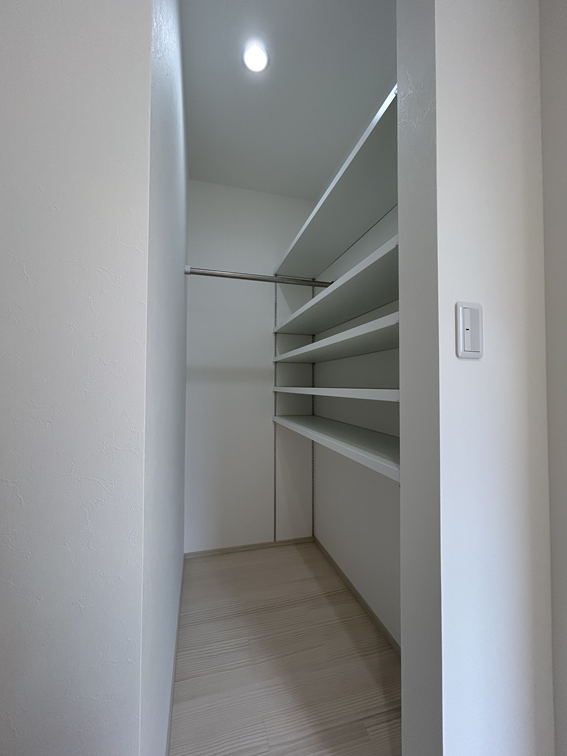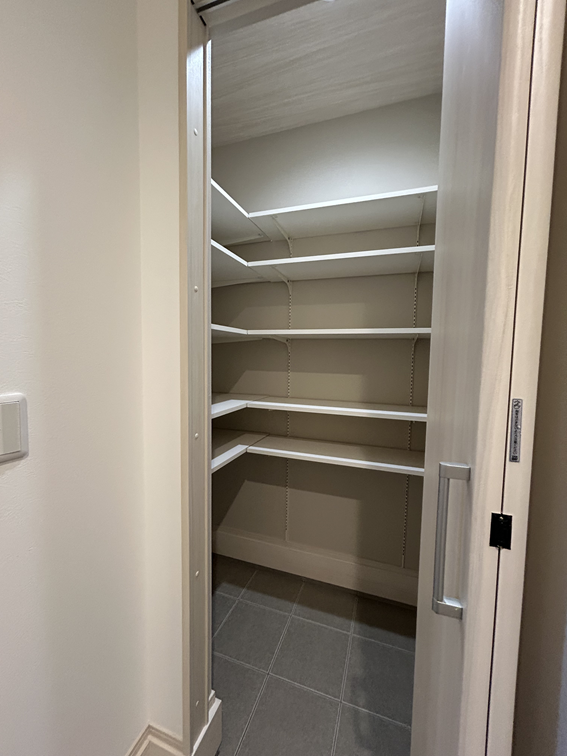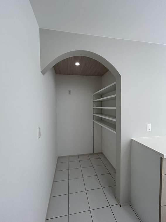 パントリーは、キッチンの奥に配置され、R壁が柔らかな印象を与える入り口となっています。