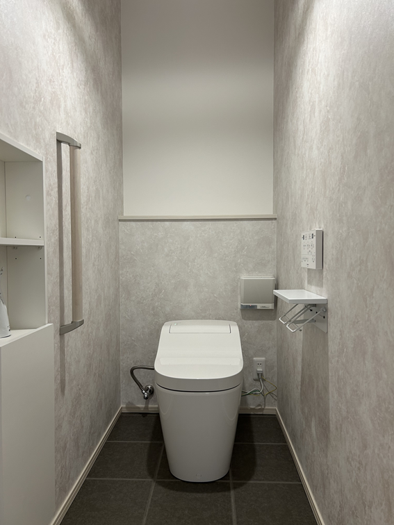 玄関近くに位置し、空間を広く見せるタンクレストイレを採用。