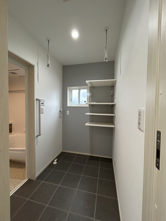 脱衣所には、タオルや衣類などの収納に便利な可動棚と、雨の日や夜間の洗濯に役立つ物干し金物を備え付けました。