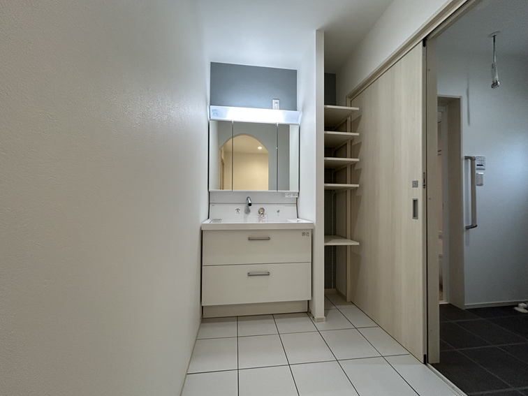 また洗面化粧台の横に可動棚を設置し、収納力を高めました。
