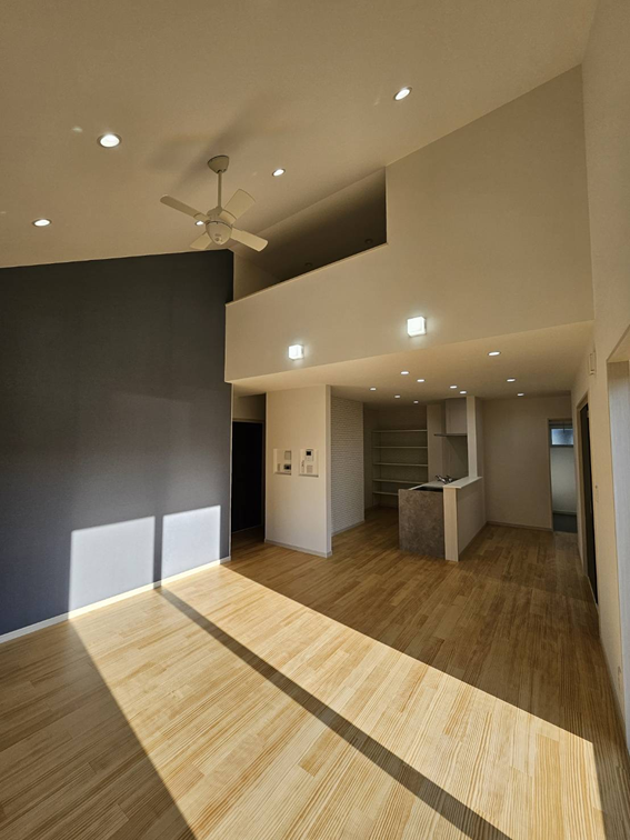 勾配天井と大きな窓から光が降り注ぐ、19.2帖の広々としたLDKです。