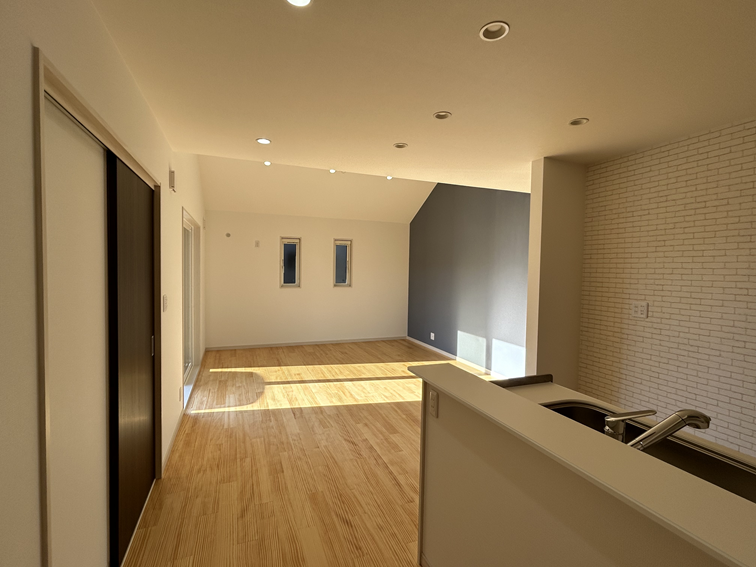 キッチン横の白レンガ調の壁紙や、リビング奥のアクセントウォールが、空間に個性をプラス。