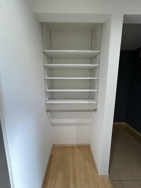 可動棚やハンガーパイプを効果的に配置することで、家中の物がすっきりと片付き、広々とした住空間を保ちます。