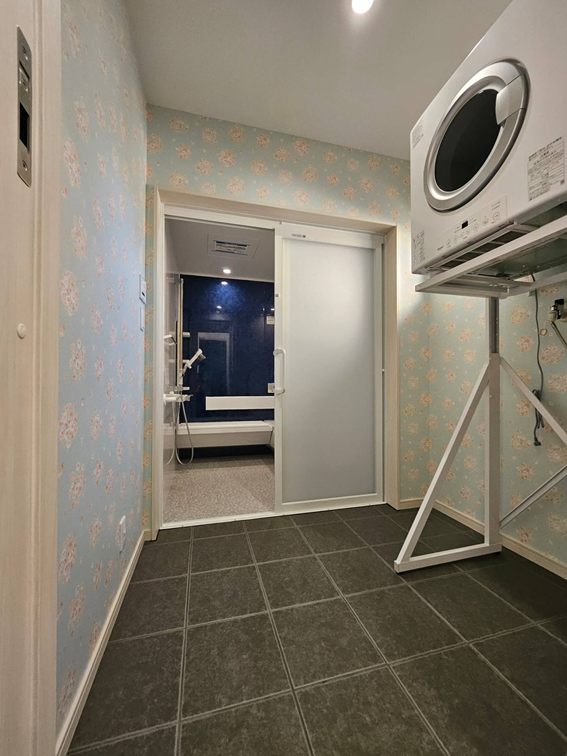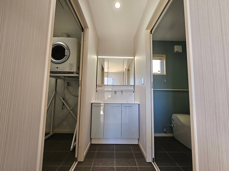 広々とした洗面脱衣所は、ご夫婦お二人が快適に身支度できる機能的な空間です。