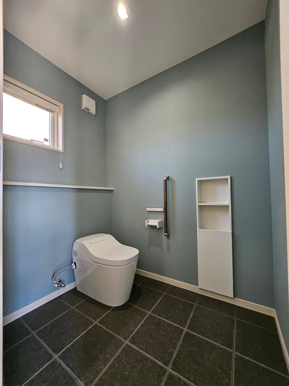 トイレは落ち着いた色味のアクセントクロスを採用し、安らげる空間に仕上げました。