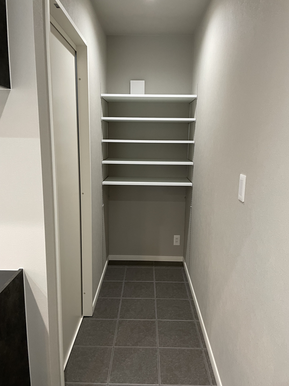 キッチンの奥には、食品のストックや調理器具をたっぷり収納できるパントリー棚を設置しました。