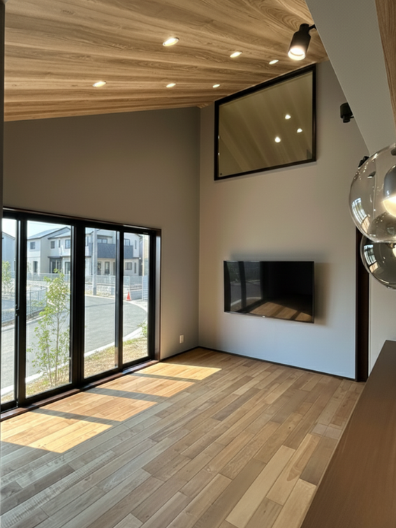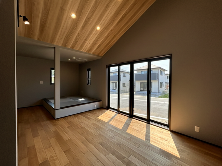 リビングには開放感抜群の勾配天井を採用し、家族がゆったりと過ごせる大空間を実現しました。