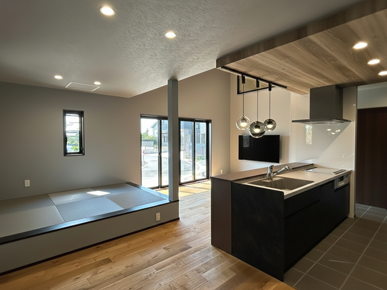 LDKの一部に小上がりで設置されたタタミコーナーは、リビング空間にメリハリと和の安らぎをもたらします。