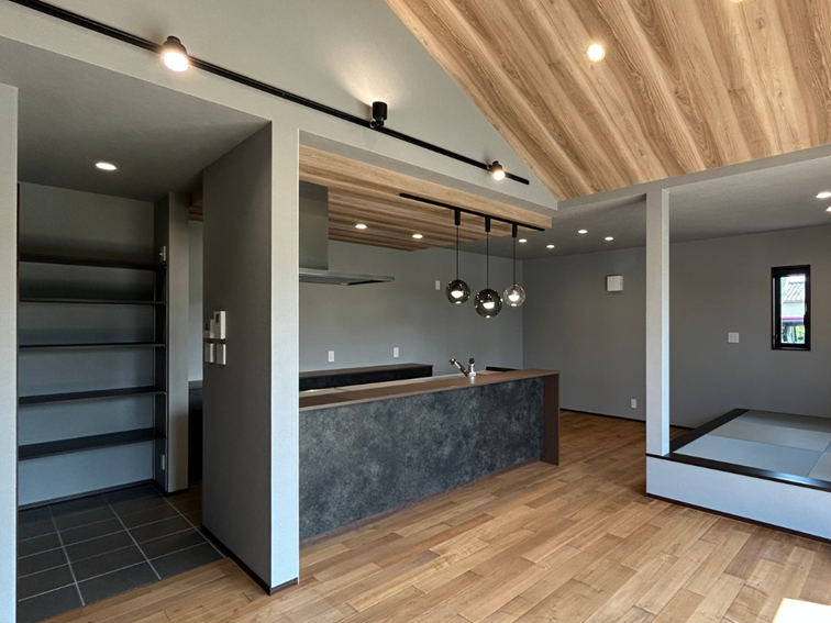 タタミコーナーを含め約21.0帖という広々とした空間に、開放感あふれる勾配天井を採用しました。
