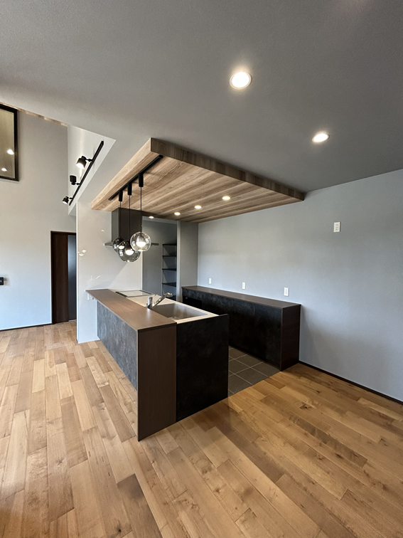 天井には木目調のアクセントを施し、暖かみのあるモダンな雰囲気を演出。