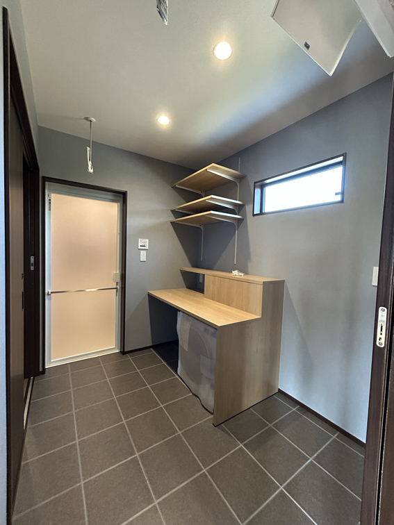 洗濯物を畳んだりアイロンがけをしたりできるカウンターと、タオルや洗剤などの整理に便利な可動棚を設置し、家事効率を高めました。