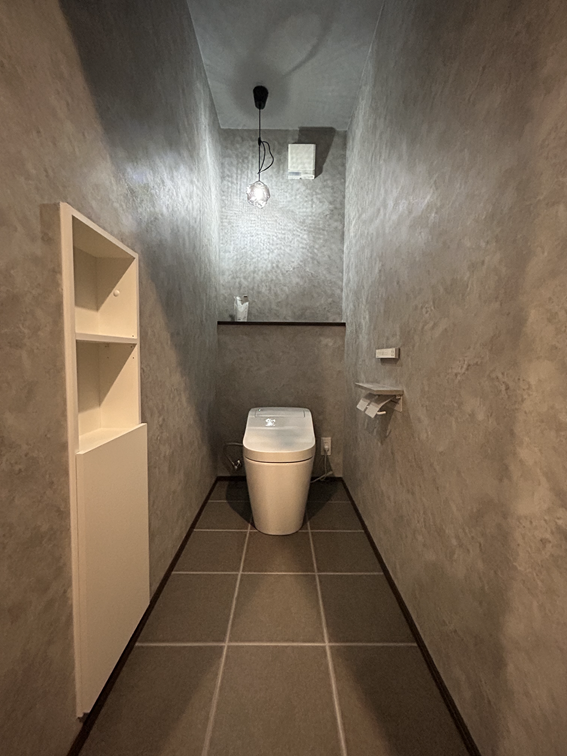 上質な素材感と落ち着いた照明にこだわった、シックでモダンなトイレ空間です。