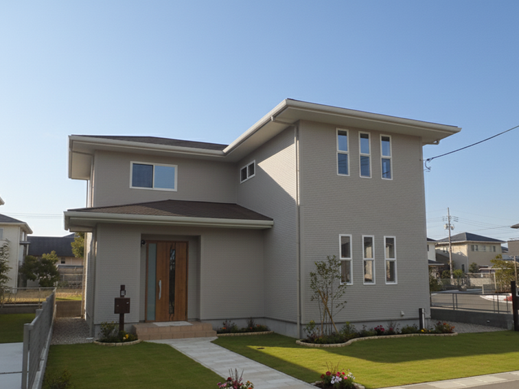 柔らかなベージュの外壁塗装とブラウンの屋根が調和した、温かみのある外観です。