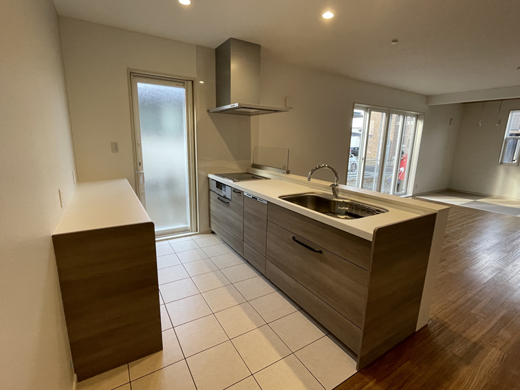 キッチンは、掃除がしやすいタイル張りの床と、開放的なオープンタイプを採用しました。