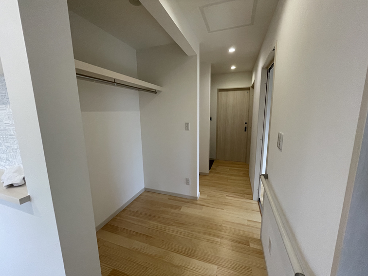 廊下には、コートや上着をさっとかけられる枕棚とハンガーパイプを設置しました。