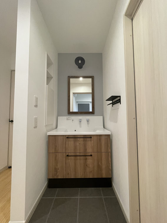 ミラーや照明にもこだわり、毎日の身支度が楽しくなる空間にしました。