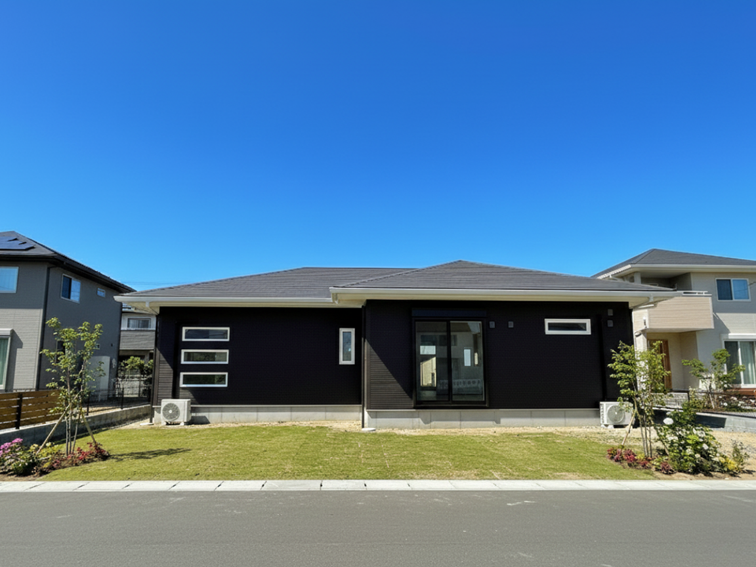 ブラウンの外壁色と白いサッシのコントラストが、落ち着きのあるモダンな雰囲気を醸し出します。