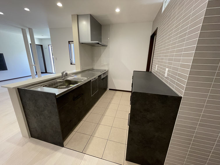 油や水はねに強いタイル張りの床を採用し、お手入れが簡単です。