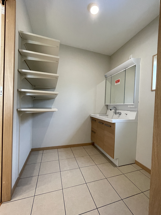 可動棚を設置し、タオルや洗剤の収納に便利です。