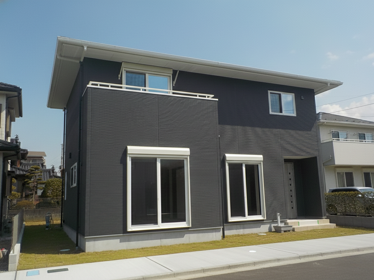 ダーク系の外壁色がシックでモダンな印象を与える2階建ての住まいです。