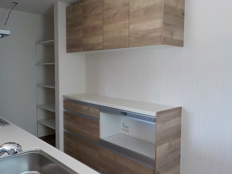 キッチン横には、食品や食器をすっきりと収納できる可動棚を設置しました。