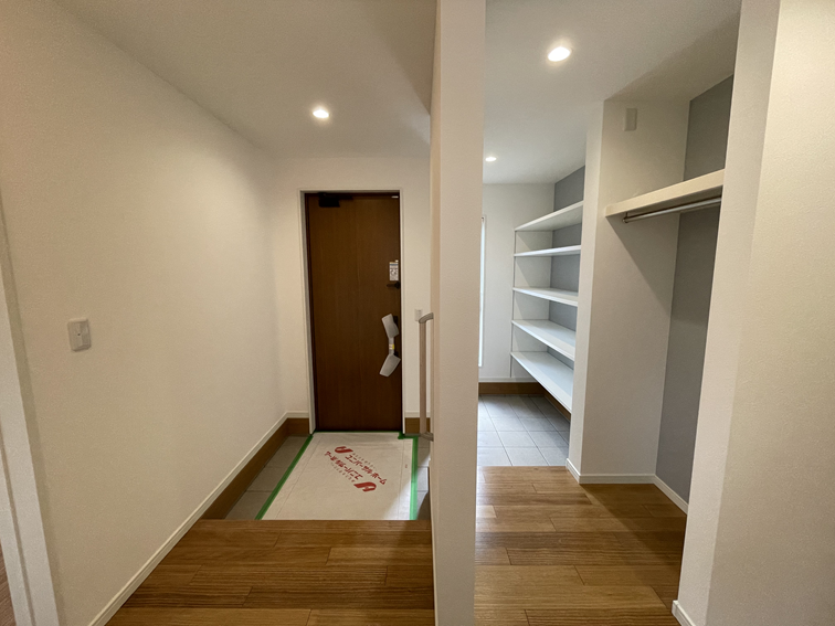 玄関から続く「便利空間」は、靴やアウトドア用品をたっぷり収納できるシューズクロークと、帰宅後すぐに上着をかけられるコートクロークを兼ね備えています。